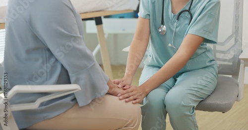 Close up Asian female doctor or nurse gently holds hands and talks with an elderly female patient in a clinic, providing comfort, empathy, and emotional care during a supportive medical consultation.