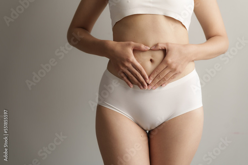Close up asian woman cropped shot with white panties on grey background, vagina healthy concept.