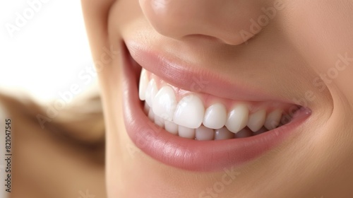 Close up beautiful white teeth smile of a woman with perfect skin for dentist practive advertising campaign