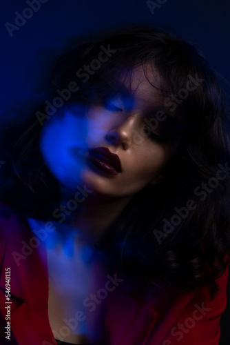 Close up beauty portrait of woman with makeup and hairstyle, wear red suit, closed eyes, over blue neon studio light.