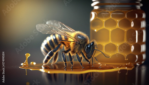 Close up Bee near the jar full of honey.