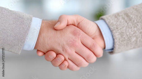Close Up Business Handshake with Bright Lighting on Textured Suit Jackets against Soft Focus Background