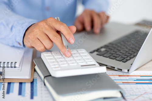 Close up Business man using calculator and laptop for do math finance on wooden desk, tax, accounting, statistics and analytical research concept