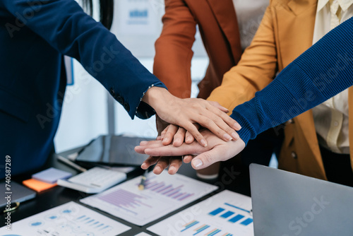 Close up business people holding each others wrists, join hands together, support and unity, team strength and power, colleagues involved in team building activity.