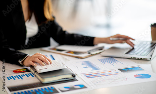 Close up Business woman using calculator and laptop for do math finance on wooden desk, tax, accounting, statistics and analytical research concept