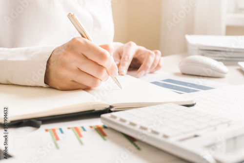 Close up business woman using laptop computer and making note on notepad in modern office.