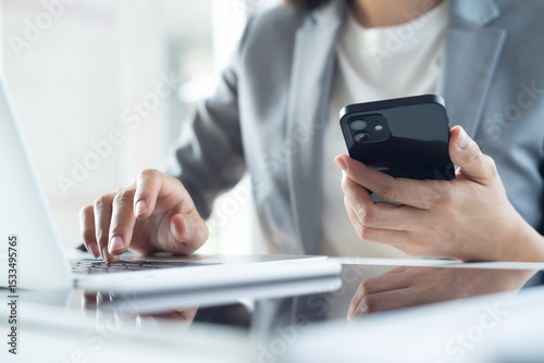 Close up, business woman using smartphone and working on laptop computer on office table. Businesswoman surfing the internet, web browsing via laptop and searching the information