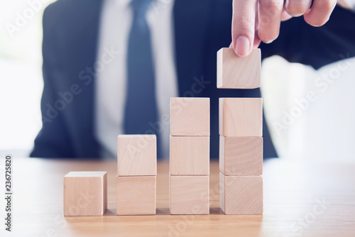 Close up Businessman hand arranging wood cube stacking as step stair. Business concept growth success process.