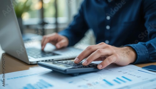 Close up businessman hand using calculator to budgeting and tax calculation monthly expenses. budget management and accounting on table. Business finance accounting banking concept.
