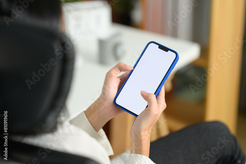 Close up businesswoman holding mobile phone with empty screen sitting at office desk