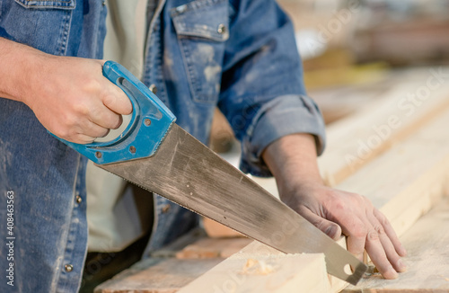 Close up carpenter sawing a board with a hand wood saw in carpentry workshop