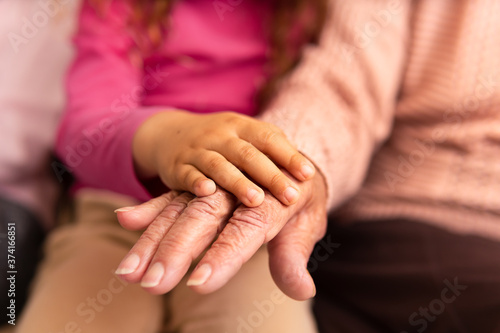 close up detail of young child and grandmother over each otherfamily, aging, care, support, unity concept.