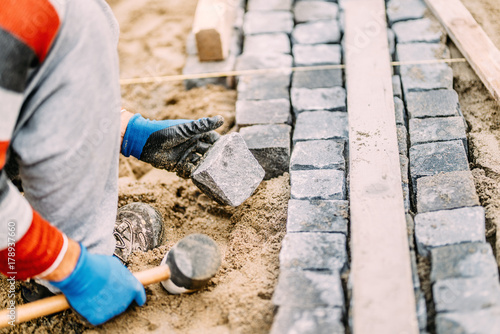 Close up details of construction works with industrial worker placing granite cobblestone blocks on path or alley