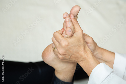 Close up em mãos de massagista aplicando massagem terapêutica no pé de um paciente.