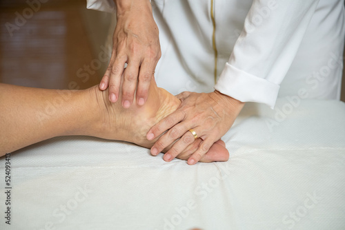 Close up em mãos de massagista aplicando massagem terapêutica no pé de um paciente.