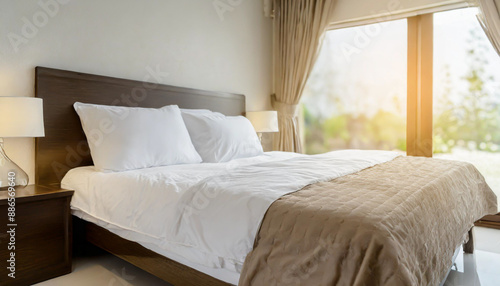 close up empty bed with pillows and blanket in the bedroom