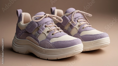 Close up extra wide shoe construction featuring swelling accommodation design and comfortable fit technology in gentle lavender and white color scheme.