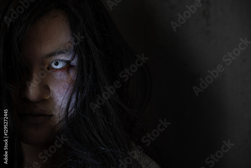 Close up face of Asian woman ghost or zombie horror creepy scary