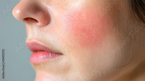 Close up face of young woman suffering from problem skin. Acne, rosacea, dry skin. Dermatology concept