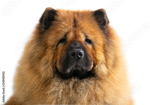 close up face portrait of gorgeous chow chow dog isolated on white background