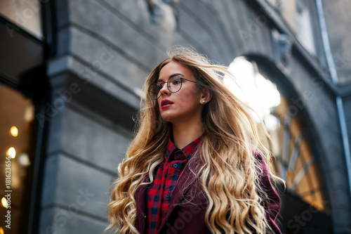 Close up fashion street stile portrait of pretty girl in fall casual outfit Beautiful blond posing outdoor.