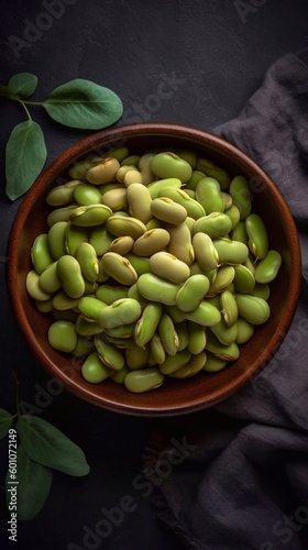 Close up fava beans in clay bowl on dark background. Raw Organic Fresh Green Fava Beans. AI generated
