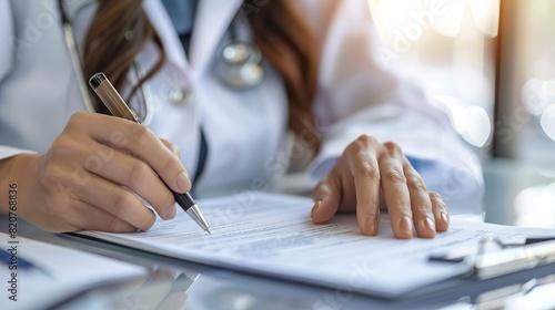 Close up female doctor hands writing paper on desk in the hospital or clinic office