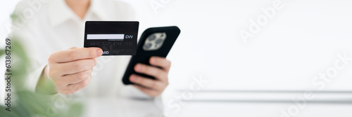 Close up female hands holding credit card and smartphone, young woman paying online, using banking service, entering information, shopping, ordering in internet store, doing secure payment