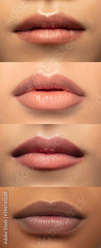 Close up female lips. Faces of beautiful multi-ethnic young women, focus on lipstick. Human emotions, facial expression, cosmetology, body and skin care concept. Vertical collage. Flyer for ad.
