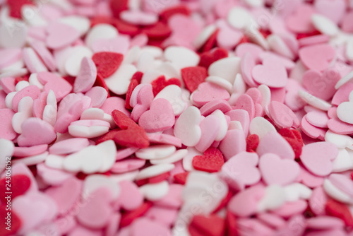 Close up flatlay shot of hundreds of small heart-shaped sugar sprinkles in red, pink and white for Valentine's day card, symbol for love, emotion or romantic feelings as background or wallpaper image
