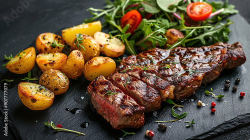 Close up food photography of beef steak with rosemary, potatoes, and salad. Wallpaper, photo for restaurant advertisement, product advertisement.