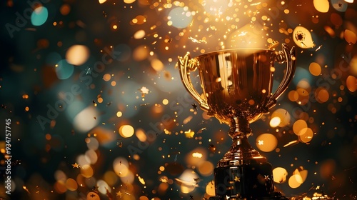 close up golden trophy award with falling confetti. copy space for text. 3d rendering.