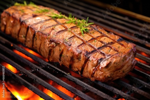 close up grilled seitan steak on the grill top