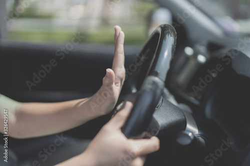 Close up hand of female Driver Pressing Horn Car , Feeling Angry and hopeless While Driving. concept of Car traffic at rush hour in downtown area of the city and people. Car pollution