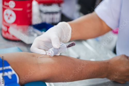 Close up hand of nurse, taking blood sample from a patient in the hospital.