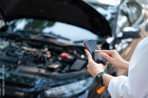 Close up hand of woman using a mobile phone call a car mechanic because car was broken. Contacting car technician or need help concept.