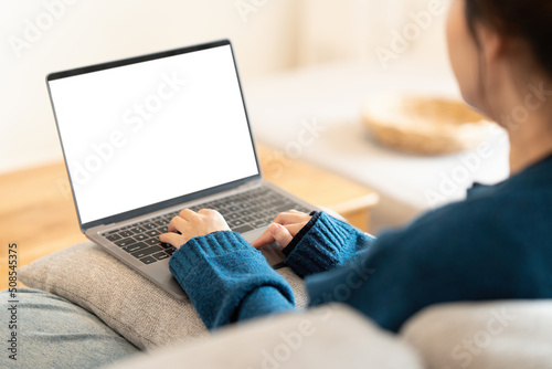 Close up hand of Young Asian woman using social media by laptop. Lifestyle ,Shopping online, relax on sofa.