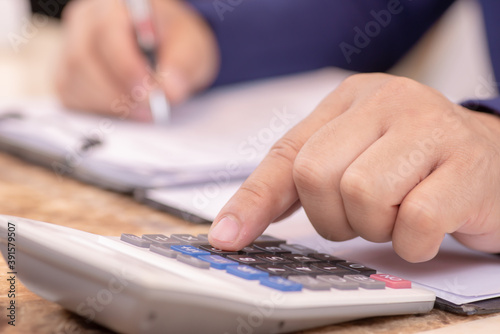 Close up hand using calculator for analysis maketing plan, Finance and Accounting concepts, selective focus
