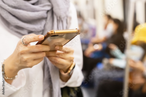 close up hand woman holding mobile phone or smartphone in subway train transit system public.