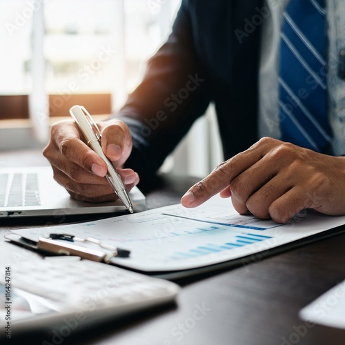 Close up hands businessman doing finances with using calculator and writing note in office.