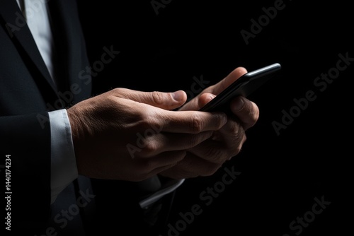 Close Up Hands in Dark Suit Holding Smartphone Against a Black Background in a Studio with Focused Lighting