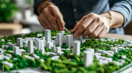 Close up hands of an urban planner architect shaping a sustainable city model with green spaces. Eco friendly urban design and sustainable planning principles