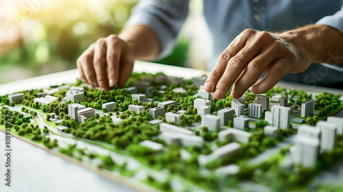 Close up hands of an urban planner architect shaping a sustainable city model with green spaces. Eco friendly urban design and sustainable planning principles