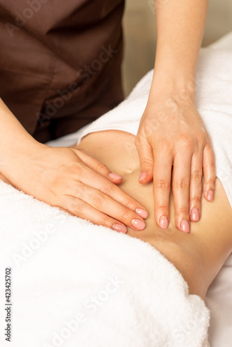 Close up hands of chiropractor or masseur making relaxing massage of stomach for lying woman in clinic interior. Professional woman doctor masseur during work with patient