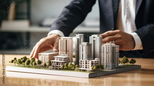 Close up hands of male architects or developer analysing joint project for a future residential complex.