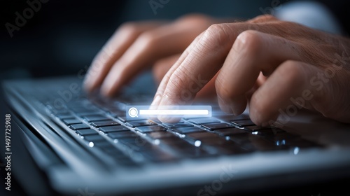 Close Up Hands Typing On Laptop Keyboard With Glowing Search Bar