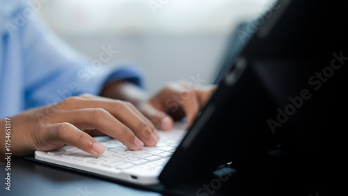 Close Up Hands Typing on Tablet Keyboard for Remote Work and Online Learning