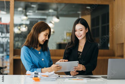 Close up happy young asian businesswoman using laptop with laughing female mentor in coworking boardroom at meeting. Smiling diverse woman managers talking about new business concept.