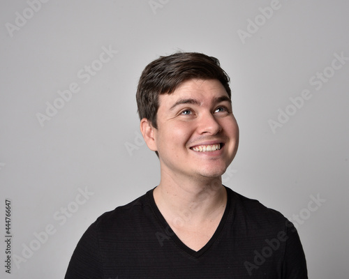 Close up head and shoulders portrait of a brunette. young man with a variety of expressive facial expressions. Isolated on a light grey studio background.
