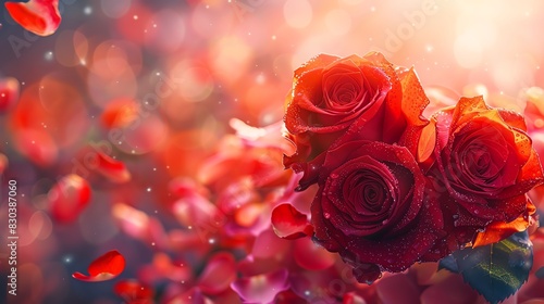Close up heart with red roses, copy space, warm colors, Double exposure silhouette with petals,